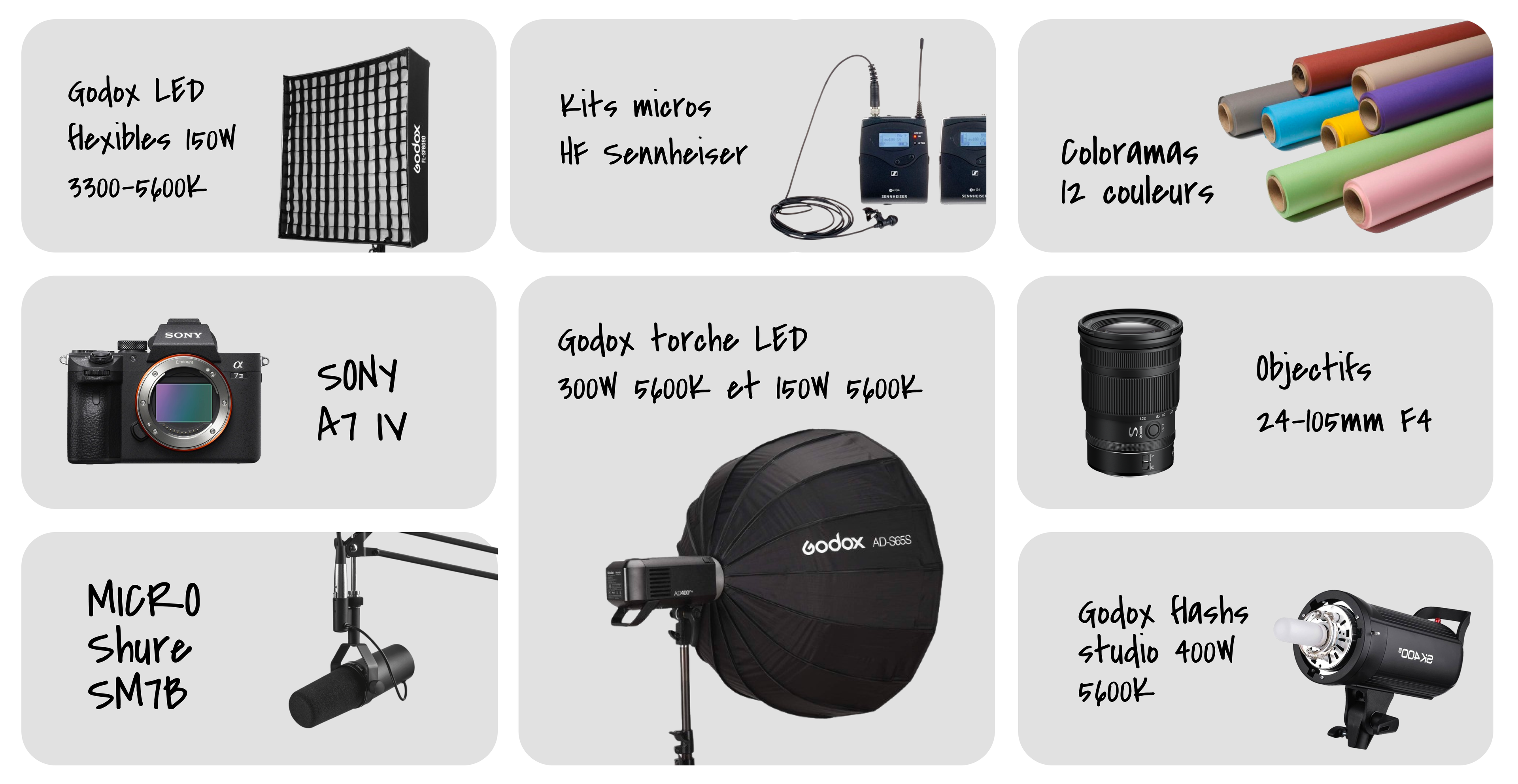 Tout le matériel est inclus (coloramas, lumières, trépieds, etc) à l'exception des caméras